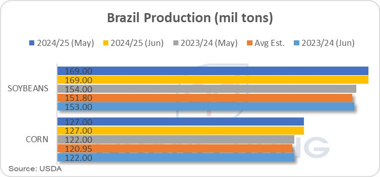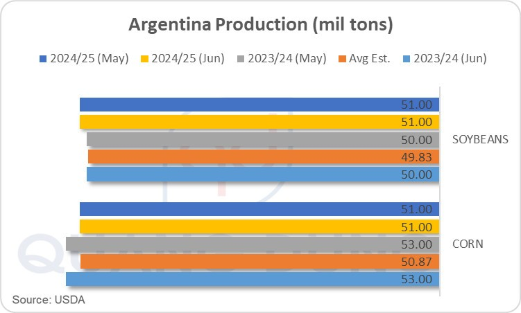 Tại Nam Mỹ, Bộ NN Mỹ đã hạ nhẹ tiềm năng sản lượng của Brazil xuống 153 triệu tấn. Sản lượng của Argentina được giữ không thay đổi, ở mức 56,8 triệu tấn. Tồn trữ cuối kỳ toàn cầu cho năm 2024/25 giảm nhẹ, với ước tính mới là 127 triệu tấn.