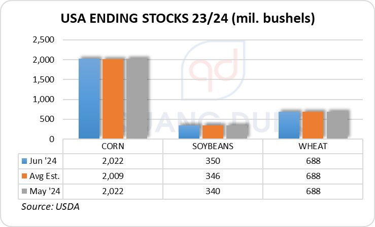 Báo cáo Ước tính Cung cầu Nông nghiệp Thế giới tháng Sáu của Bộ NN Mỹ khiến giá ngũ cốc giảm do dự trữ lúa mì trong nước và toàn cầu dồi dào. Giá lúa mì giảm từ 1,5% đến 3%, giá đậu nành giảm và giá bắp tăng nhẹ.