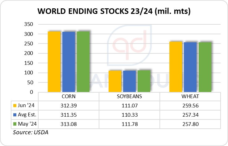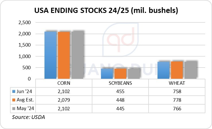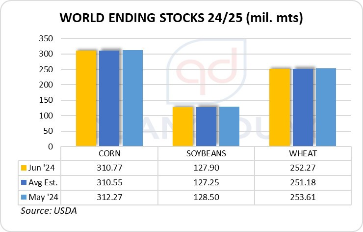 Tồn trữ cuối kỳ của Hoa Kỳ cho năm 2024/25 ở mức 2,102 tỷ giạ, cao hơn một chút so với dự đoán thương mại là 2,079 tỷ. Tồn trữ cuối kỳ toàn cầu giảm nhẹ xuống 12,235 tỷ giạ.