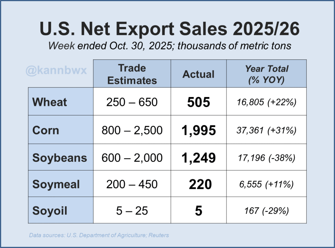USDA báo cáo doanh số xuất khẩu đậu nành tuần kết thúc ngày 30/10 đạt 45,9 triệu giạ (tương đương 1,25 triệu tấn), còn lượng giao hàng thực tế đạt 37,8 triệu giạ – cao hơn mức trung bình 30,6 triệu giạ mỗi tuần cần thiết để đạt mục tiêu xuất khẩu 1,635 tỷ giạ cho niên vụ 2025–2026.