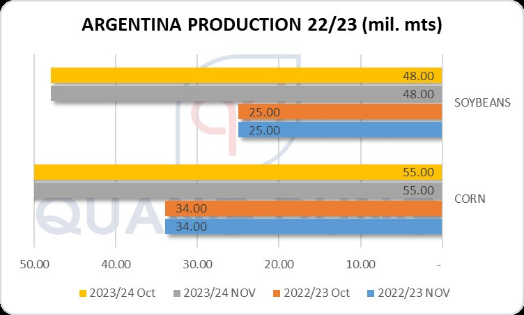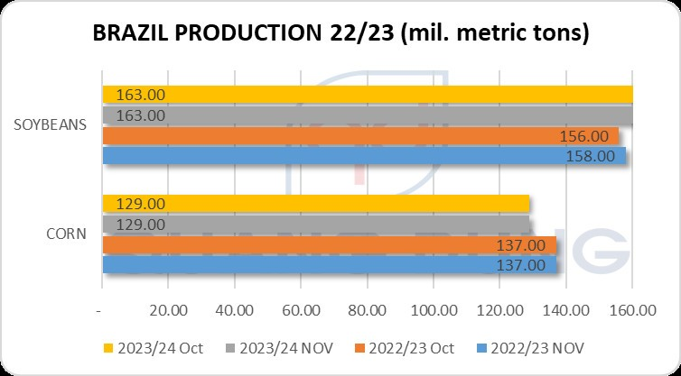 Trên toàn cầu, tồn trữ cuối kỳ cho năm tiếp thị 2023-24 là 114,51 triệu tấn, giảm 1,11 triệu tấn so với tháng trước. Sự thay đổi chủ yếu là do lượng hàng tồn trữ ban đầu thấp hơn. Bộ NN Mỹ dự báo sản lượng đậu nành của Brazil là 163 triệu tấn, và của Argentina là 48 triệu tấn.
