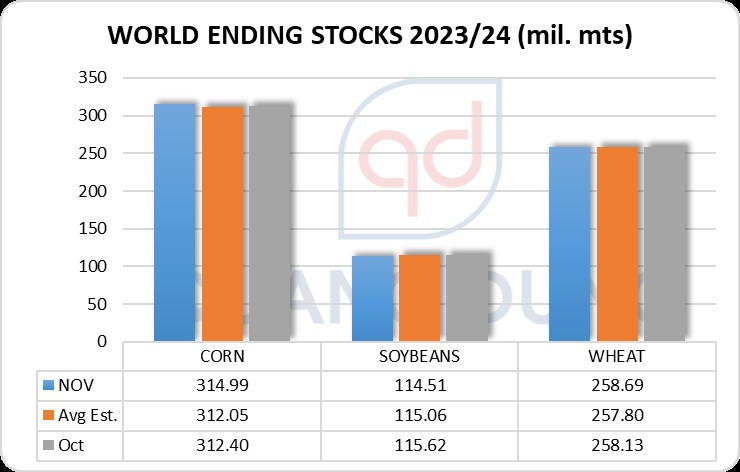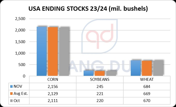 Bộ NN Mỹ ước tính sản lượng lúa mì của Mỹ ở mức 1,812 tỷ giạ, không thay đổi so với ước tính tháng 10. Ước tính tồn trữ cuối kỳ ở mức 684 triệu giạ, tăng so với ước tính 670 triệu giạ vào tháng 10. Tiêu thụ lúa mì của Mỹ ước tính đạt 1,86 tỷ giạ, không thay đổi so với tháng 10.