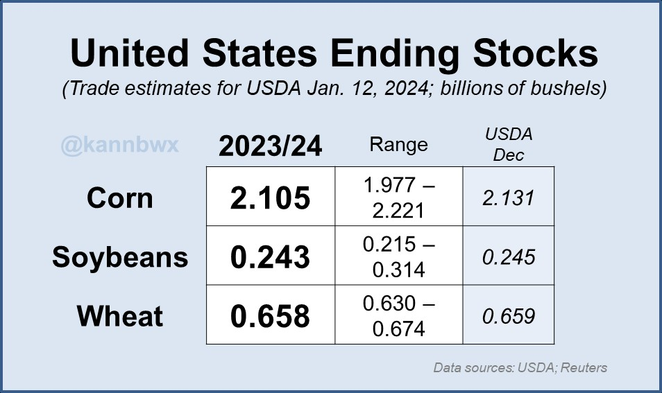 Trong tuần kết thúc vào ngày 04/1, lượng xuất khẩu bắp tăng 19,2 triệu giạ (487.600 tấn) cho năm 2023-2024. Lượng xếp hàng xuất khẩu đạt 40,8 triệu giạ, thấp hơn mức cần thiết hàng tuần để đạt ước tính xuất khẩu 2,1 tỷ giạ (53,34 triệu tấn) của Bộ NN Mỹ cho năm 2023-2024. Cam kết xuất bán bắp hiện đạt tổng cộng 1,192 tỷ giạ (30,28 triệu tấn) cho năm 2023-2024 và tăng 38% so với một năm trước.