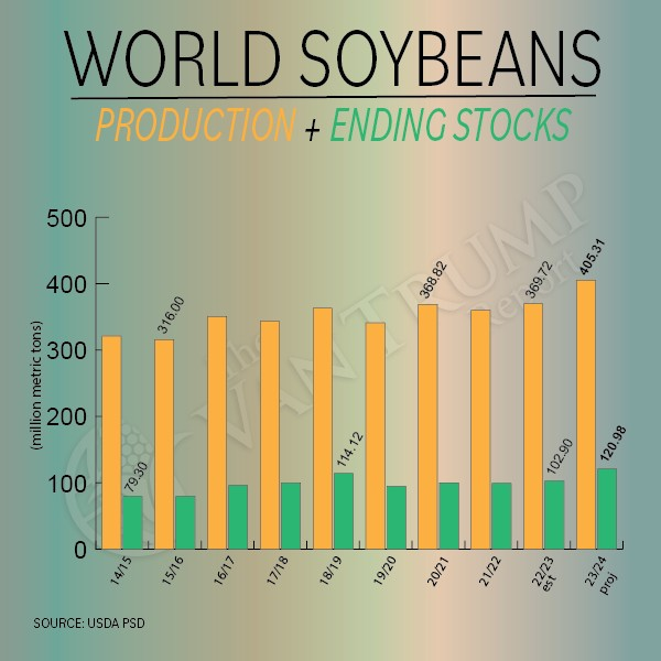 Trên toàn cầu, tồn trữ đậu nành cuối năm 2023-2024 giảm 1,6 triệu tấn, xuống 119 triệu tấn “chủ yếu do tồn trữ thấp hơn của Mỹ.” Đối với niên vụ cũ 2022-2023, Bộ NN Mỹ nâng lượng tồn trữ cuối vụ toàn cầu lên 103,1 triệu tấn, đạt mức cao như kỳ vọng trước báo cáo.