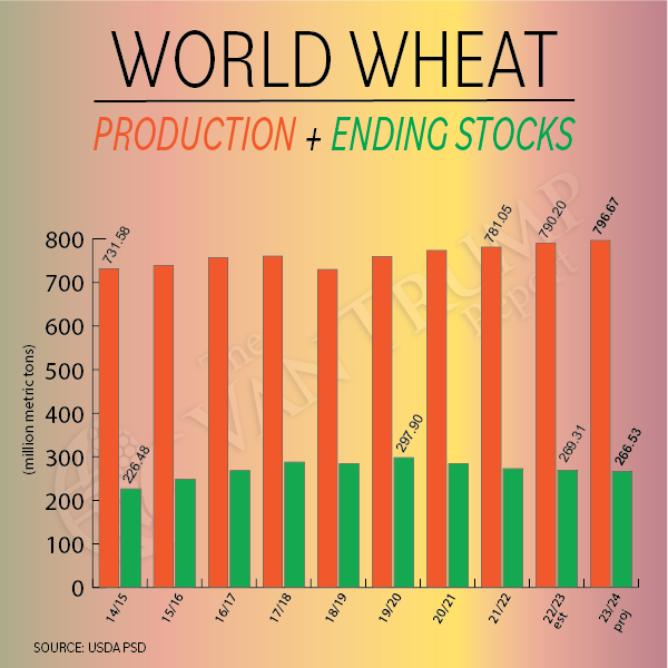Tồn trữ lúa mì cuối kỳ niên vụ 2023-2024 là 615 triệu giạ, tăng từ mức 592 triệu giạ trong báo cáo tháng Bảy. Trên toàn cầu, Bộ NN Mỹ giảm tồn trữ cuối kỳ xuống 265,61 triệu tấn, từ mức 266,53 triệu tấn trong tháng Bảy. Tồn trữ đầu kỳ giảm xuống 268,31 triệu tấn và sản lượng giảm xuống 793,37 triệu tấn.