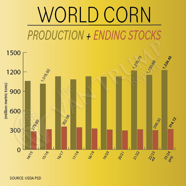 Tồn trữ đầu kỳ cho niên vụ 2023-2024 được dự báo tăng thêm 5 triệu giạ. Kết quả là nguồn cung tổng thể là 4,496 tỷ giạ, thấp hơn 79 triệu giạ so với ước tính của tháng trước. Về phía cầu, Bộ NN Mỹ giảm mức xuất khẩu 25 triệu giạ, khiến tổng lượng sử dụng giảm tương ứng. Kết quả cuối cùng là tồn trữ cuối kỳ giảm 55 triệu giạ, xuống còn 245 triệu giạ, cũng nằm trong phạm vi ước tính trước báo cáo.