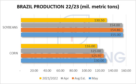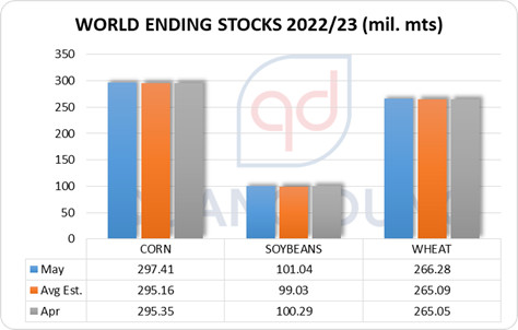 Trên toàn cầu, hầu hết thị trường đều tương đồng với ước tính cho vụ mùa cũ vì Nam Mỹ vừa kết thúc thu hoạch. Đối với niên vụ 2022-23, Bộ NN Mỹ điều chỉnh mức tồn trữ cuối kỳ toàn cầu tăng 0,75 triệu tấn, lên 101,04 triệu tấn. Dự báo sản lượng của Brazil tăng 1 triệu tấn, lên 155 tấn, trong khi của Argentina không thay đổi ở mức 27 triệu tấn.