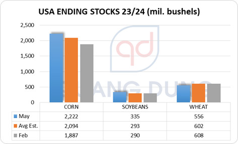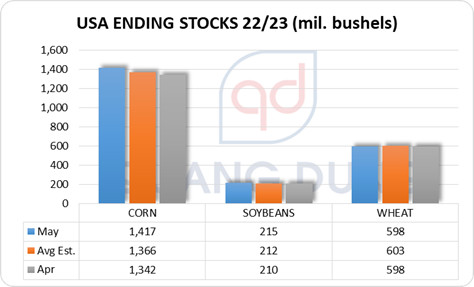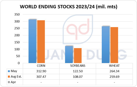 Đối với năm tiếp thị 2023-24, Bộ NN Mỹ ước tính tồn trữ cuối kỳ tăng lên 335 triệu giạ (9,12 triệu tấn). Đối với vụ cũ (năm 2022-23), Bộ NN Mỹ ước tính tồn trữ cuối kỳ ở mức 215 triệu giạ (5,85 triệu tấn), tăng 5 triệu giạ so với tháng trước.