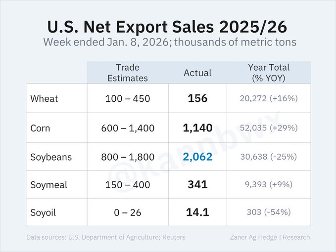 Tổng hợp lại, trong tuần kết thúc ngày 8/1/2026, USDA ghi nhận doanh số đậu nành niên vụ 2025–2026 tăng 75,8 triệu giạ (khoảng 2,06 triệu tấn), trong khi niên vụ 2026–2027 tăng thêm 0,4 triệu giạ. Lượng giao hàng thực tế đạt 60,2 triệu giạ, cao hơn nhiều so với mức trung bình cần thiết để đạt mục tiêu xuất khẩu cả năm. Dù vậy, tổng cam kết xuất khẩu đậu nành niên vụ hiện tại vẫn thấp hơn khoảng 25% so với cùng kỳ năm ngoái, cho thấy thị trường vẫn còn dư địa phục hồi nhưng chưa thực sự bền vững.
