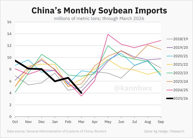Tính đến giữa niên vụ 2025/26, tổng lượng nhập khẩu đậu nành của Trung Quốc vẫn ở mức cao nhất trong 3 năm, nhưng vẫn thấp hơn mức trung bình 5 năm do lượng hàng từ Mỹ về ở mức tối thiểu. Thị trường hiện kỳ vọng lượng nhập khẩu sẽ bật tăng mạnh lên trên 10 triệu tấn/tháng trong giai đoạn từ tháng 4 đến tháng 6 — ba tháng có thể quyết định rất nhiều đến nhịp mua hàng và cán cân cung cầu đậu nành toàn cầu.