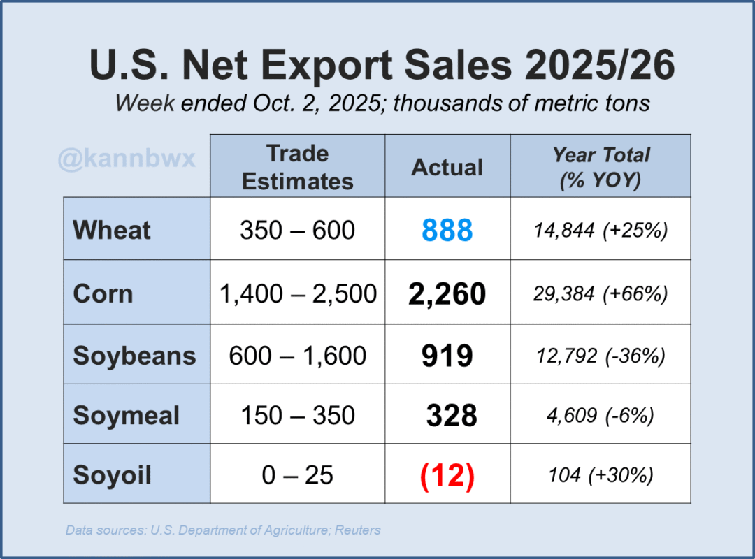 Theo USDA, doanh số xuất khẩu lúa mì trong tuần kết thúc ngày 2/10 đạt 32,6 triệu giạ (887.900 tấn), trong khi xuất khẩu thực tế đạt 22,6 triệu giạ, cao hơn mức cần thiết để đạt mục tiêu 900 triệu giạ cả năm. Tổng cam kết xuất khẩu lũy kế đạt 545 triệu giạ, tăng 25% so với cùng kỳ, song tồn kho cuối kỳ của Mỹ vẫn cao hơn trung bình 5 năm gần 24%. Dữ liệu tháng 8 cho thấy xuất khẩu lúa mì đạt 2,69 triệu tấn, cao nhất trong 9 năm qua, tăng gần 17% so với cùng kỳ.
